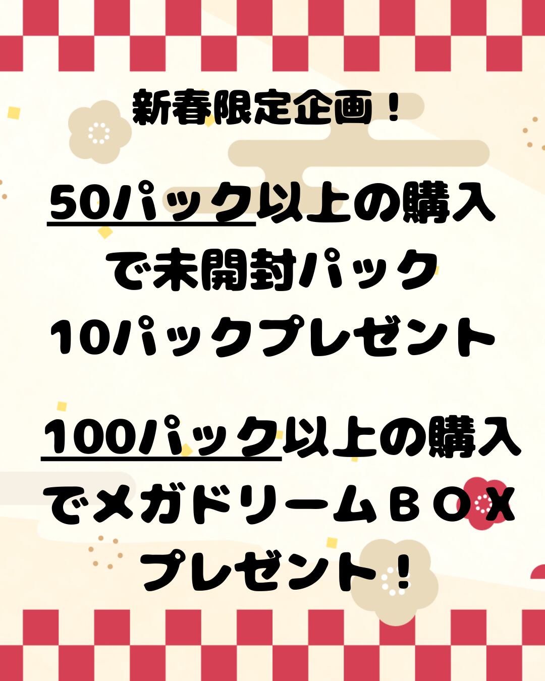 今回は、新春オリパということで新春限定企画も準備してあります。50パック以上の購入で院開封パックを10パック(*メガブレイブ・メガシンフォニアなどのレギュラーパックの未開封になります。)